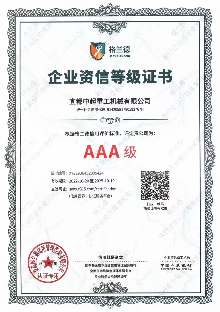 2022年宜都中起重工機(jī)械有限公司被格蘭德信用評價(jià)為AAA級(jí)企業(yè)。
